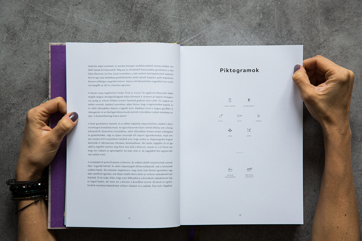 There are 12 chapters in the book each starting with an introduction to the monthly available ingredients. Therefore we applied for each section different fruit and vegetable patterns made with analogue technics. We used paint to colour the cross sections of the ingredients, then we scanned the prints made with “vegetable stamps” and created patterns with the vegetable’s very own forms and inner structures. 12 month offers practical knowledge on seasonal ingredients accompanied by sophisticated recipes and passionate thoughts on gastronomy. The pictograms indicate options for consumption too as we marked those meals which are easily portable. For delicate technical details we used silver and matte black hot foil, blind embossing and a bright yellow hard cover binding. The end sheets got a radiating purple tone which is an unofficial identity colour, a secret favourite of the author. The beating beetroot logo of the publishing company reveals the meaning behind Artbeet – a pun for heartbeat, a metamorphosis of a beating heart. The word "art" is representing the artistic values the publications carry and "beet" is for evoking gastronomy.