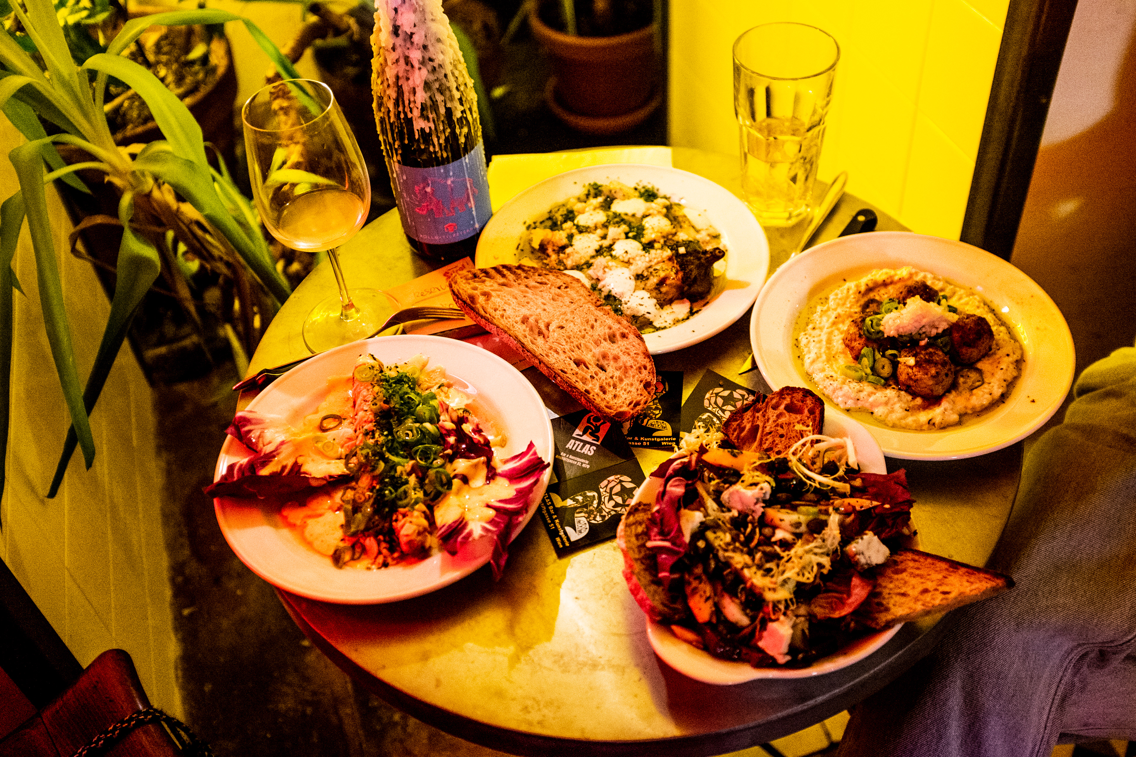 Situated within a century-old building in Vienna, this multifaceted venue called Atlas, managed by close friends and family, seamlessly blends history with modernity. It serves as a dynamic space, combining elements of a brunch destination, a bar, a natural wine haven, and a contemporary art gallery. The venue caters to a diverse audience, including Vienna-based artists, hipsters, and loyal patrons of the previous bar.