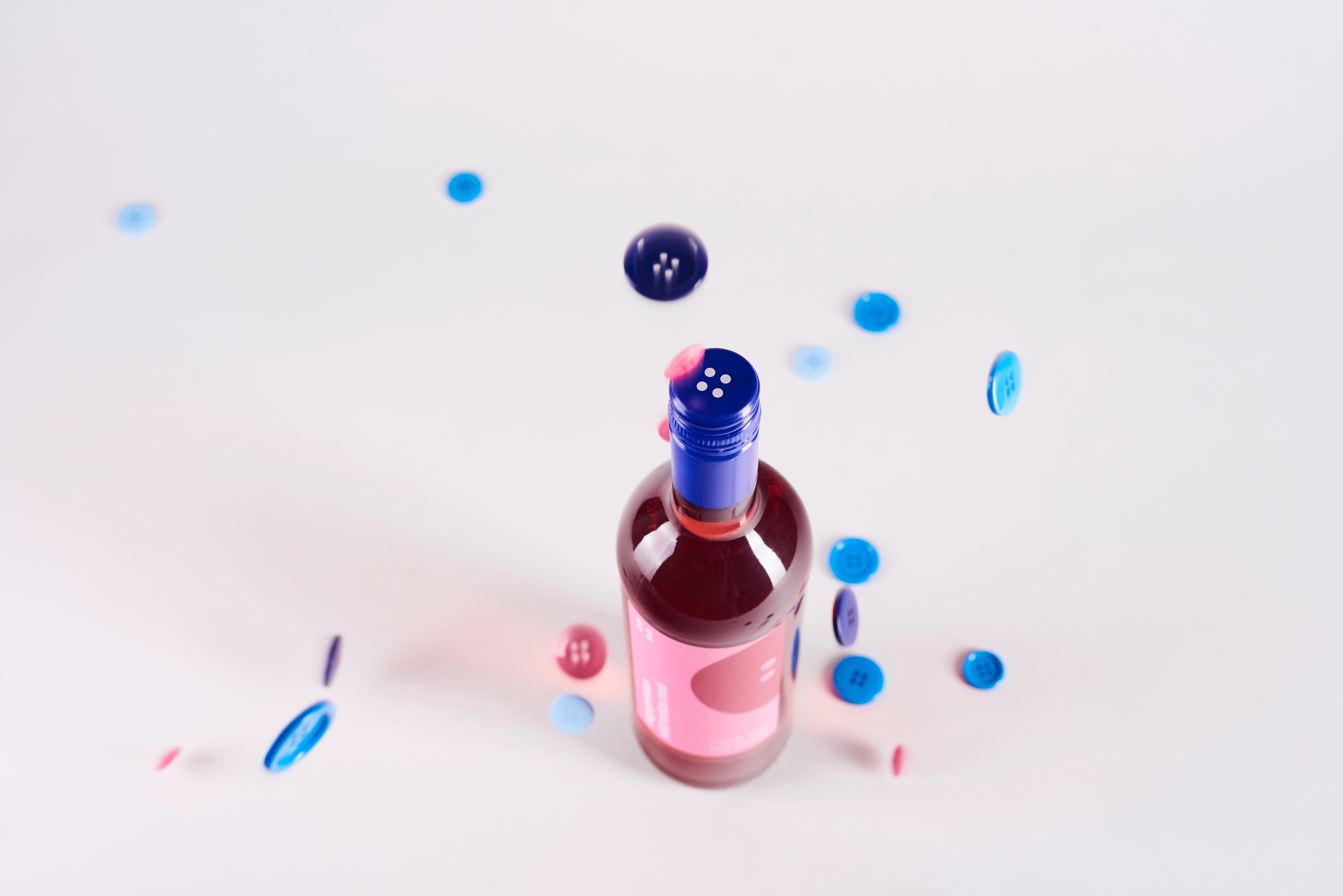With all this in mind, we decided on a playful direction and colours that match the stunning pink of the wine. Each label features half of a button, so that when two bottles are placed next to each other they form one large button. Another button also graces the top of the bottle.