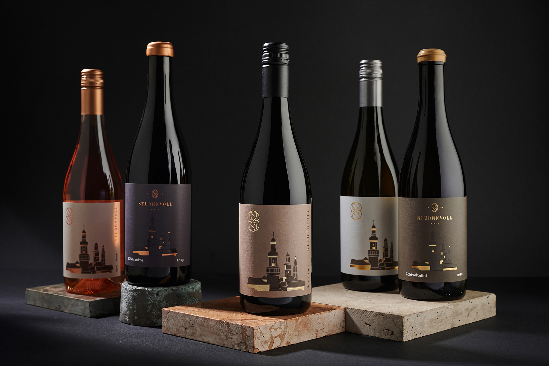 The view of the city of Sopron, with its iconic fire tower, is memorialised on the wine label. The wines are categorised into two series, differentiated by lighter labels, for red, white, and rosé wine, and darker ones for kékfrankos and zöldveltelini wines.